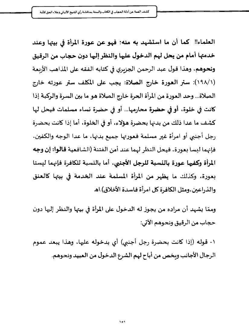 العلماء!! كما أن ما استشهد به منه؛ فهو عن عورة المرأة في بيتها وعند خدمتها أمام من يحل لهم الدخول عليها والنظر إليها دون حجاب من الرقيق ونحوهم، وهذا قول عبد
