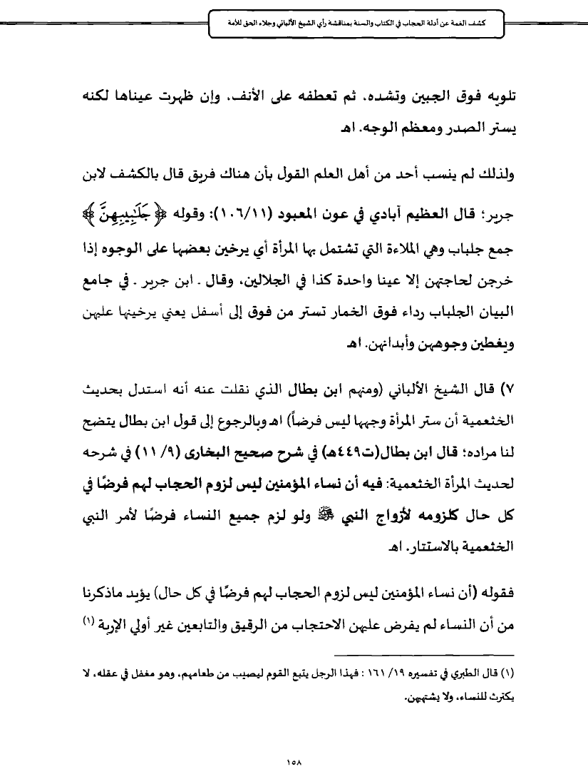 ٧) قال الشيخ الألباني (ومنهم ابن بطال الذي نقلت عنه أنه استدل بحديث الخثعمية أن ستر المرأة وجهها ليس فرضاً) اهـ وبالرجوع إلى قول ابن بطال يتضح لنا مراده؛ قال ابن بطال (ت ٤٤٩ هـ) في شرح صحيح البخارى (٩/ ١١) في شرحه لحديث المرأة الخثعمية: فيه أن نساء المؤمنين ليس لزوم الحجاب لهم فرضًا في كل حال كلزومه لأزواج النبي - صلى الله عليه وسلم - ولو لزم جميع النساء فرضًا لأمر النبي الخثعمية بالاستتار. اهـ