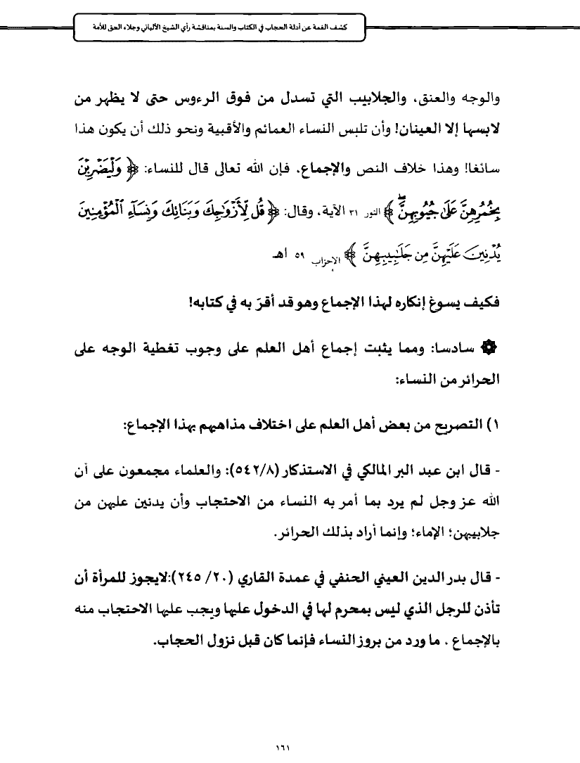 والوجه والعنق، والجلابيب التي تسدل من فوق الرءوس حتى لا يظهر من لابسها إلا العينان! وأن تلبس النساء العمائم والأقبية ونحو ذلك أن يكون هذا سائغا! وهذا خلاف النص والإجماع، فإن الله تعالى قال للنساء: {وَلْيَضْرِبْنَ بِخُمُرِهِنَّ عَلَى جُيُوبِهِنَّ} النور: ٣١ الآية، وقال: {قُلْ لِأَزْوَاجِكَ وَبَنَاتِكَ وَنِسَاءِ الْمُؤْمِنِينَ يُدْنِينَ عَلَيْهِنَّ مِنْ جَلَابِيبِهِنَّ} الأحزاب: ٥٩ اهـ.