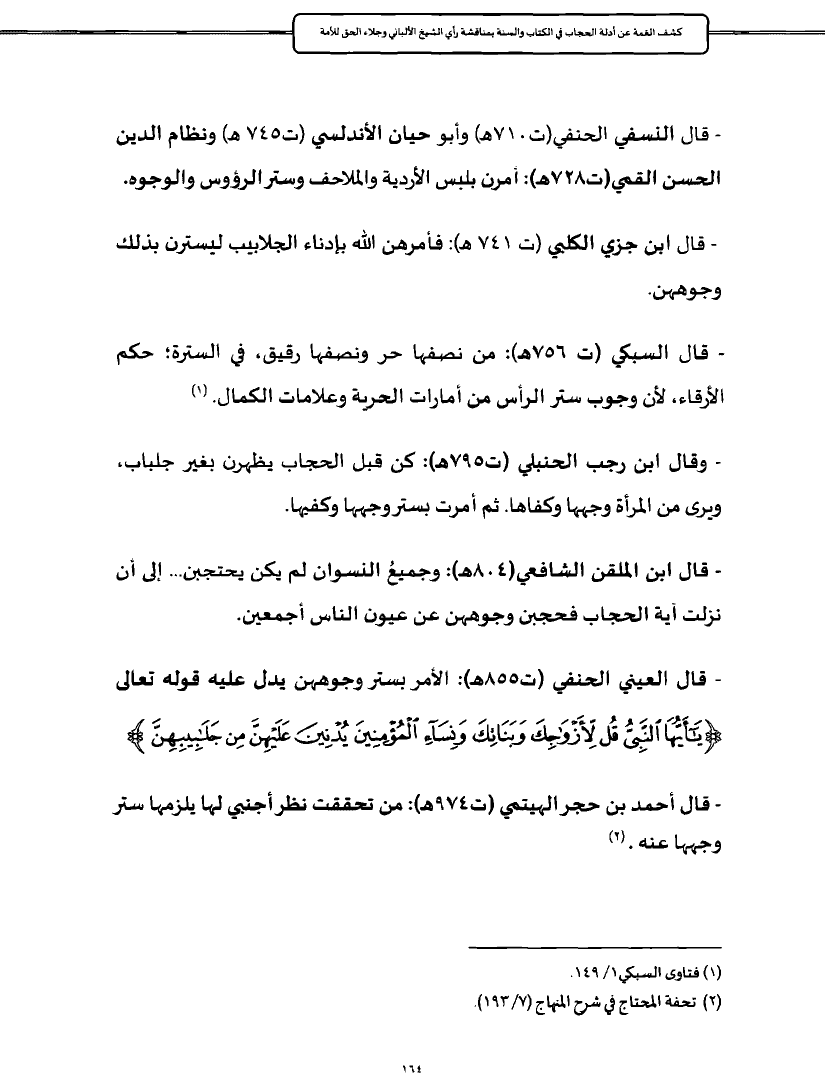- قال العيني الحنفي (ت ٨٥٥ هـ): الأمر بستر وجوههن يدل عليه قوله تعالى {يَاأَيُّهَا النَّبِيُّ قُلْ لِأَزْوَاجِكَ وَبَنَاتِكَ وَنِسَاءِ الْمُؤْمِنِينَ يُدْنِينَ عَلَيْهِنَّ مِنْ جَلَابِيبِهِنَّ}
