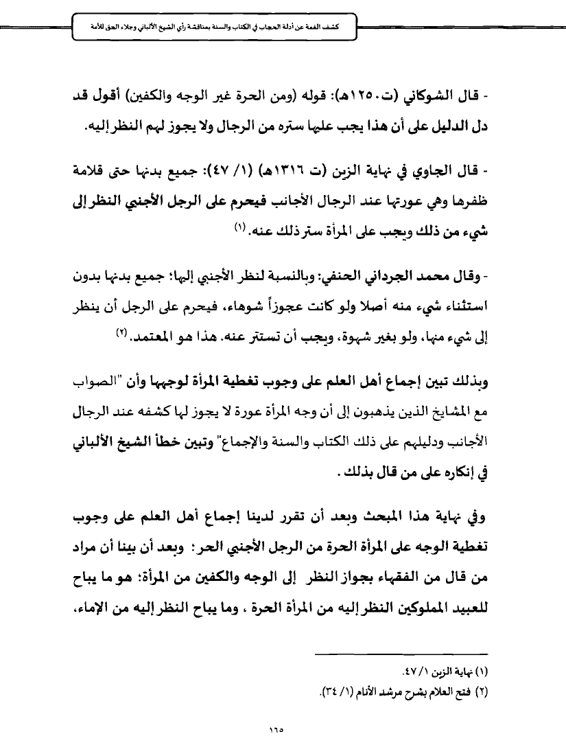 وبذلك تبين إجماع أهل العلم على وجوب تغطية المرأة لوجهها وأن "الصواب مع المشايخ الذين يذهبون إلى أن وجه المرأة عورة لا يجوز لها كشفه عند الرجال الأجانب ودليلهم على ذلك الكتاب والسنة والإجماع" وتبين خطأ الشيخ الألباني في إنكاره على من قال بذلك.