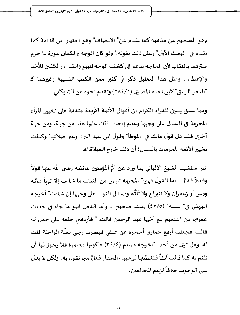 ثم استشهد الشيخ الألباني بما ورد عن أمُّ المؤمنين عائشة رضي الله عنها قولاً وفعلاً فقال: أما القول فهو: " المحرمة تلبس من الثياب ما شاءت إلا ثوباً مَسَّه ورس أو زعفران ولا تتبرقع ولا تَلَثَّم وتسدل الثوب على وجهها إن شاءت" أخرجه البيهقي في" سننه" (٥/ ٤٧) بسند صحيح ... وأما الفعل فهو ما جاء في حديث عمرتها من التنعيم مع أخيها عبد الرحمن قالت: " فأردفني خلفه على جمل له قالت: فجعلت أرفع خماري أحسره عن عنقي فيضرب رجلي بعلّة الراحلة قلت له: وهل ترى من أحد ... "أخرجه مسلم (٤/ ٣٤) فلكونها معتمرة فلا يجوز لها أن تلثم به كما قالت آنفاً فتغطيتها لوجهها بالسدل فعلٌ منها نقول به، ولكن لا يدل على الوجوب خلافاً لزعم المخالفين.
