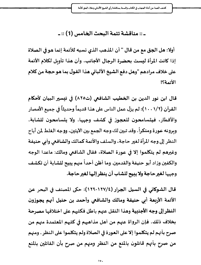 أولا: هل الجق مع من قال " أن المذهب الذي نسبه للأئمة إنما هو في الصلاة إذا كانت المرأة ليست بحضرة الرجال الأجانب، وأن هذا تأويل لكلام الأئمة على خلاف مرادهم "وهل دفع الشيخ الألباني هذا القول بما هو حجة من كلام الأئمة؟!