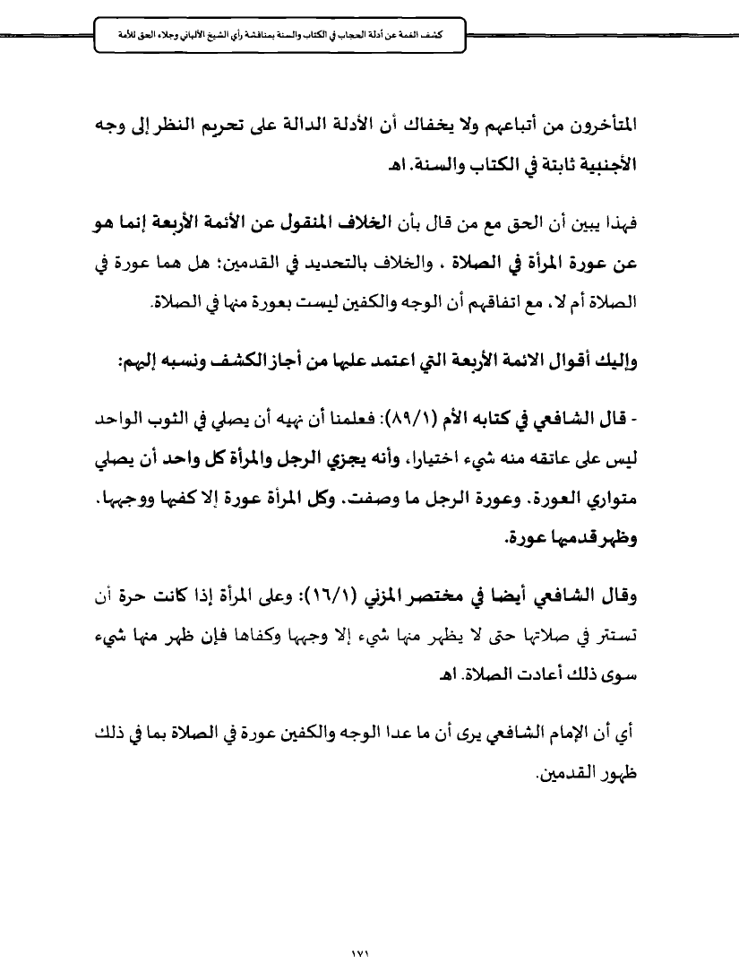 فهذا يبين أن الحق مع من قال بأن الخلاف المنقول عن الأئمة الأربعة إنما هو عن عورة المرأة في الصلاة، والخلاف بالتحديد في القدمين؛ هل هما عورة في الصلاة أم لا، مع اتفاقهم أن الوجه والكفين ليست بعورة منها في الصلاة.