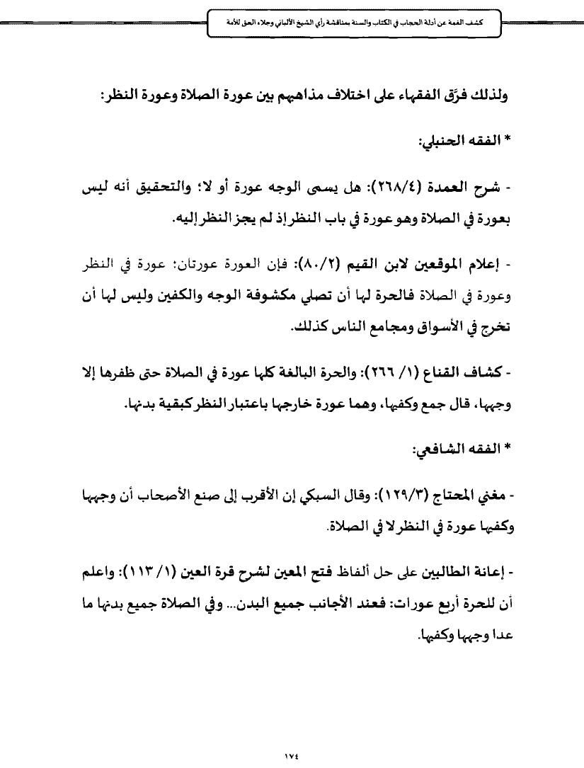 - إعلام الموقعين لابن القيم (٢/ ٨٠): فإن العورة عورتان؛ عورة في النظر وعورة في الصلاة فالحرة لها أن تصلي مكشوفة الوجه والكفين وليس لها أن تخرج في الأسواق ومجامع الناس كذلك.