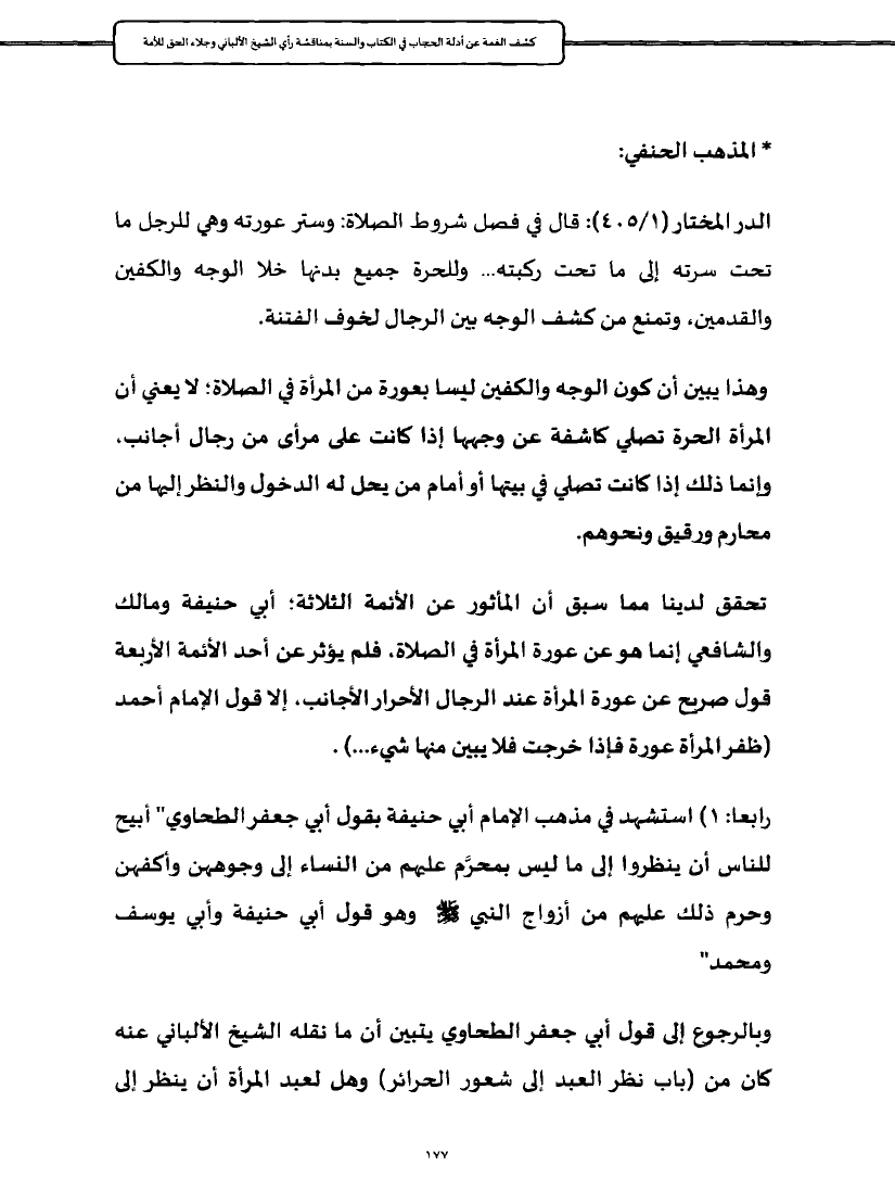 رابعا: ١) استشهد في مذهب الإمام أبي حنيفة بقول أبي جعفر الطحاوي" أبيح للناس أن ينظروا إلى ما ليس بمحرَّم عليهم من النساء إلى وجوههن وأكفهن وحرم ذلك عليهم من أزواج النبي - صلى الله عليه وسلم - وهو قول أبي حنيفة وأبي يوسف ومحمد"