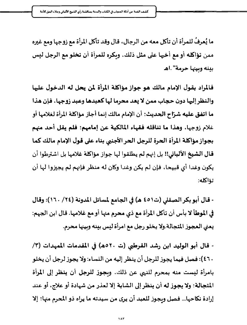- قال أبو بكر الصقلي (ت ٤٥١ هـ) في الجامع لمسائل المدونة (٢٤/ ١٦٠): وقال في الموطأ لا بأس أن تأكل المرأة مع ذي محرم منها أو مع غلامها. قال ابن الجهم: يعني العجوز المتجالة. ولا يخلو رجل مع امرأة ليس بينه وبينها محرم.