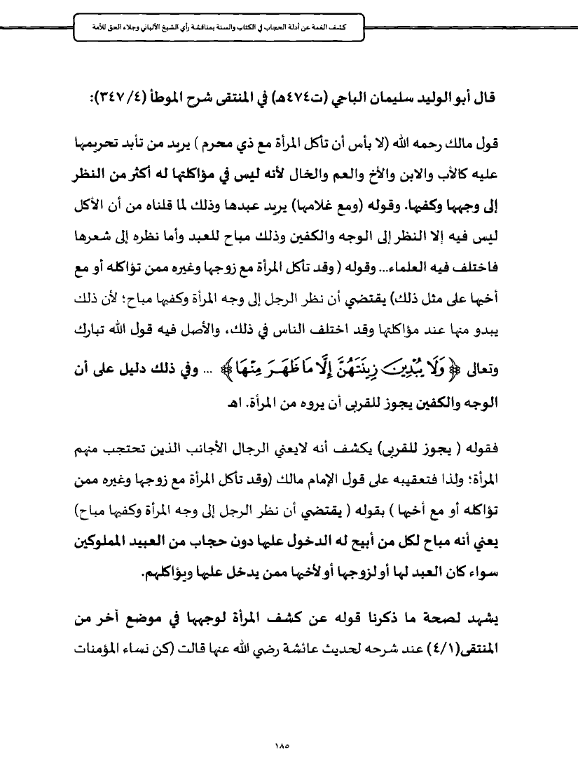 يشهد لصحة ما ذكرنا قوله عن كشف المرأة لوجهها في موضع آخر من المنتقى (١/ ٤) عند شرحه لحديث عائشة رضي الله عنها قالت (كن نساء المؤمنات