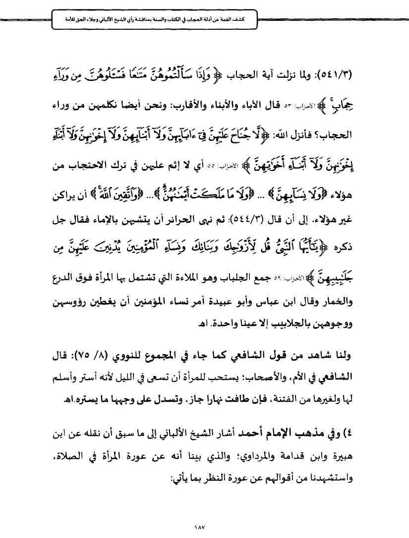 ٤) وفي مذهب الإمام أحمد أشار الشيخ الألباني إلى ما سبق أن نقله عن ابن هبيرة وابن قدامة والمرداوي؛ والذي بينا أنه عن عورة المرأة في الصلاة، واستشهدنا من أقوالهم عن عورة النظر بما يأتي: