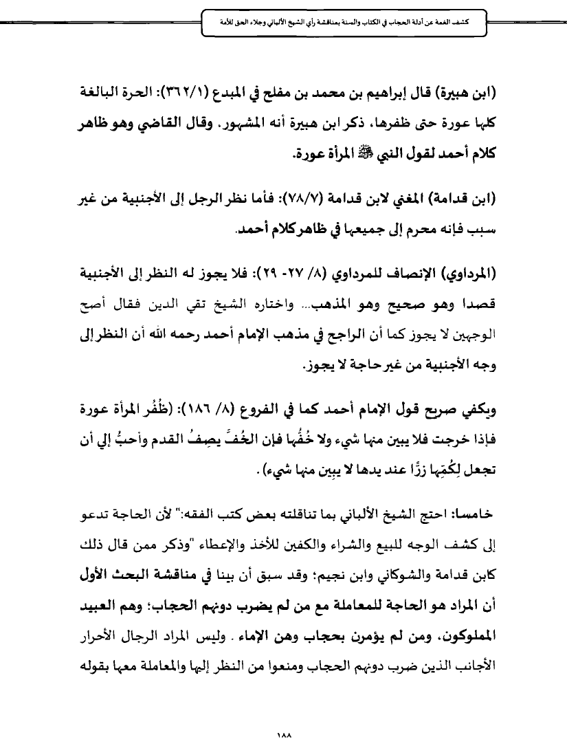 خامسا: احتج الشيخ الألباني بما تناقلته بعض كتب الفقه: " لأن الحاجة تدعو إلى كشف الوجه للبيع والشراء والكفين للأخذ والإعطاء "وذكر ممن قال ذلك كابن قدامة والشوكاني وابن نجيم؛ وقد سبق أن بينا في مناقشة البحث الأول أن المراد هو الحاجة للمعاملة مع من لم يضرب دونهم الحجاب؛ وهم العبيد المملوكون، ومن لم يؤمرن بحجاب وهن الإماء. وليس المراد الرجال الأحرار الأجانب الذين ضرب دونهم الحجاب ومنعوا من النظر إليها والمعاملة معها بقوله