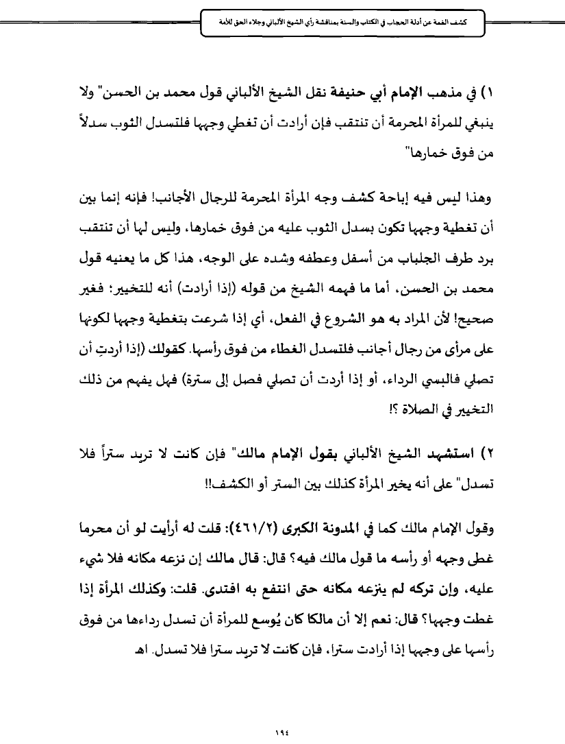 ٢) استشهد الشيخ الألباني بقول الإمام مالك" فإن كانت لا تريد ستراً فلا تسدل" على أنه يخير المرأة كذلك بين الستر أو الكشف!!