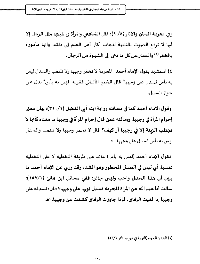 ٤) استشهد بقول الإمام أحمد" المحرمة لا تخمِّر وجهها ولا تتنقب والسدل ليس به بأس تسدل على وجهها" قال الشيخ الألباني فقوله" ليس به بأس" يدل على جواز السدل.
