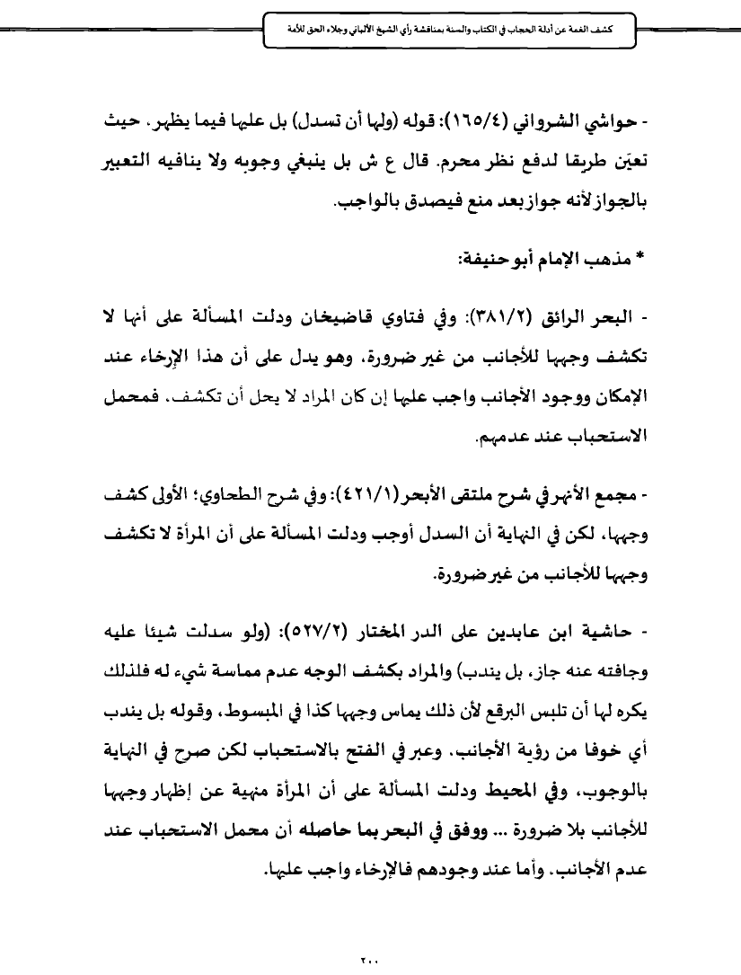 - البحر الرائق (٢/ ٣٨١): وفي فتاوي قاضيخان ودلت المسألة على أنها لا تكشف وجهها للأجانب من غير ضرورة، وهو يدل على أن هذا الإِرخاء عند الإمكان ووجود الأجانب واجب عليها إن كان المراد لا يحل أن تكشف، فمحمل الاستحباب عند عدمهم.