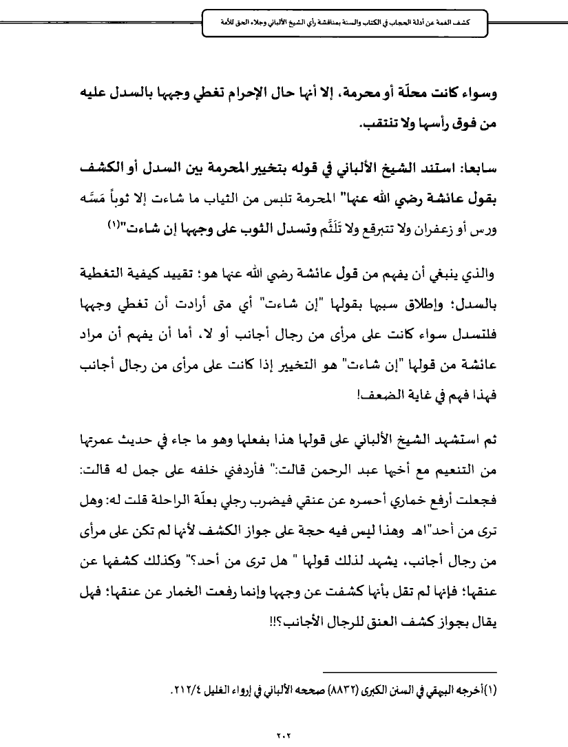 سابعا: استند الشيخ الألباني في قوله بتخيير المحرمة بين السدل أو الكشف بقول عائشة رضي الله عنها" المحرمة تلبس من الثياب ما شاءت إلا ثوباً مَسَّه ورس أو زعفران ولا تتبرقع ولا تَلَثَّم وتسدل الثوب على وجهها إن شاءت" (¬١)