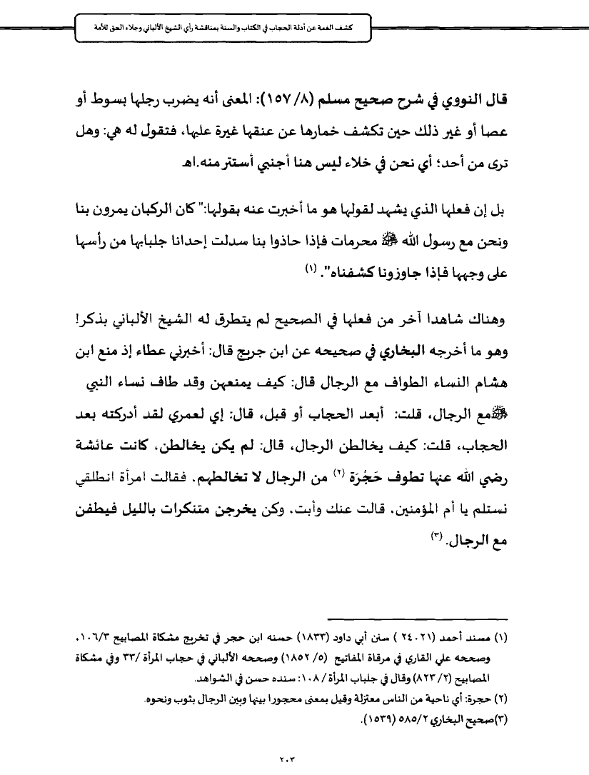 وهناك شاهدا آخر من فعلها في الصحيح لم يتطرق له الشيخ الألباني بذكر! وهو ما أخرجه البخاري في صحيحه عن ابن جريج قال: أخبرني عطاء إذ منع ابن هشام النساء الطواف مع الرجال قال: كيف يمنعهن وقد طاف نساء النبي - صلى الله عليه وسلم - مع الرجال، قلت: أبعد الحجاب أو قبل، قال: إي لعمري لقد أدركته بعد الحجاب، قلت: كيف يخالطن الرجال، قال: لم يكن يخالطن، كانت عائشة رضي الله عنها تطوف حَجْرَة (¬٢) من الرجال لا تخالطهم، فقالت امرأة انطلقي نستلم يا أم المؤمنين، قالت عنك وأبت، وكن يخرجن متنكرات بالليل فيطفن مع الرجال. (¬٣)