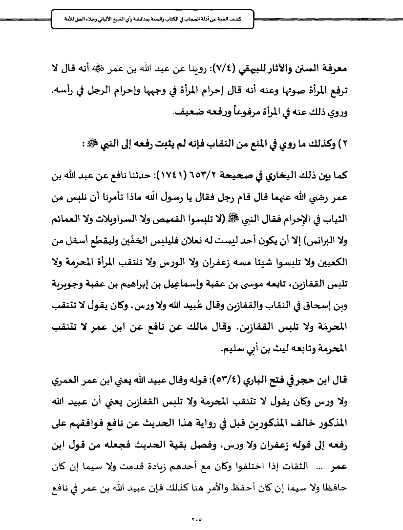 كما بين ذلك البخاري في صحيحة ٢/ ٦٥٣ (١٧٤١): حدثنا نافع عن عبد الله بن عمر رضي الله عنهما قال قام رجل فقال يا رسول الَله ماذا تأمرنا أن نلبس من الثياب في الإِحرام فقال النبي - صلى الله عليه وسلم - (لا تلبسوا القميص ولا السراويلات ولا العمائم ولا البرانس) إلا أن يكون أحد ليست له نعلان فليلبس الخفّين وليقطع أسفل من الكعبين ولا تلبسوا شيئا مسه زعفران ولا الورس ولا تنتقب المرأة المحرمة ولا تلبس القفازين، تابعه موسى بن عقبة وإسماعِيل بن إبراهيم بن عقبة وجويرية وبن إسحاق في النقاب والقفازين وقال عُبيد الله ولا ورس، وكان يقول لا تتنقب المحرمَة ولا تلبس القفازين، وقال مالك عن نافع عن ابن عمر لا تتنقب المحرمة وتابعه ليث بن أبي سليم.
