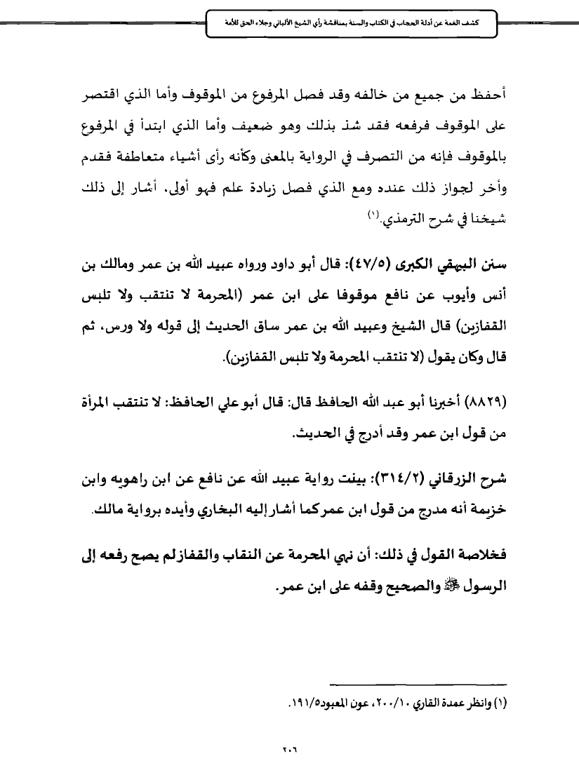 فخلاصة القول في ذلك: أن نهي المحرمة عن النقاب والقفاز لم يصح رفعه إلى الرسول - صلى الله عليه وسلم - والصحيح وقفه على ابن عمر.