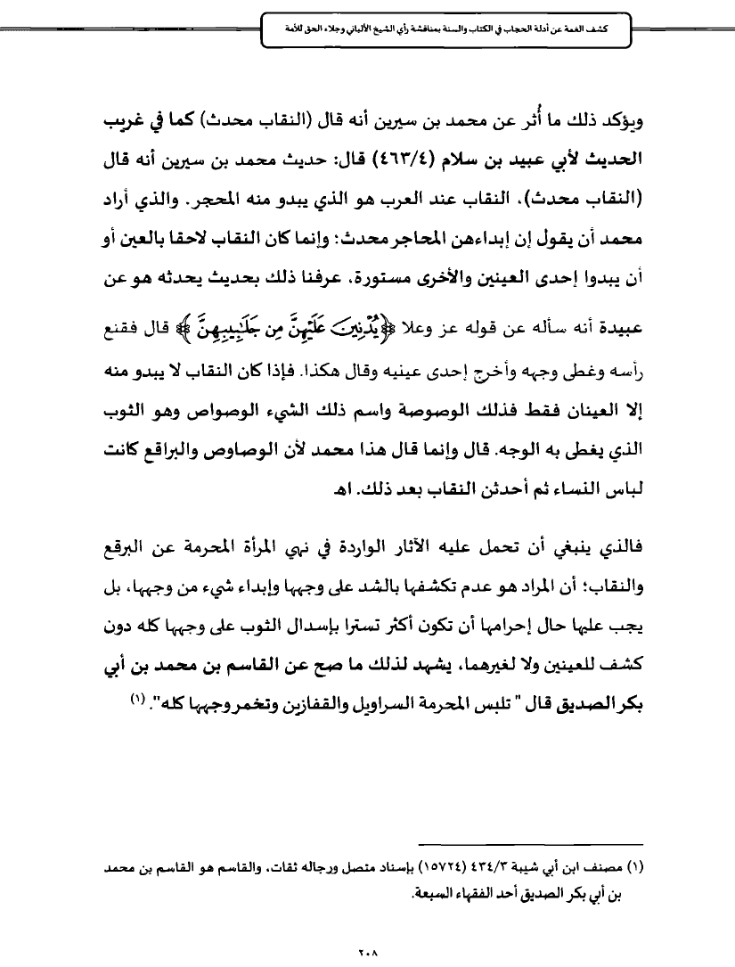 ويؤكد ذلك ما أُثر عن محمد بن سيرين أنه قال (النقاب محدث) كما في غريب الحديث لأبي عبيد بن سلام (٤/ ٤٦٣) قال: حديث محمد بن سيرين أنه قال (النقاب محدث)، النقاب عند العرب هو الذي يبدو منه المحجر، والذي أراد محمد أن يقول إن إبداءهن المحاجر محدث؛ وإنما كان النقاب لاحقا بالعين أو أن يبدوا إحدى العينين والأخرى مستورة، عرفنا ذلك بحديث يحدثه هو عن عبيدة أنه سأله عن قوله عز وعلا {يُدْنِينَ عَلَيْهِنَّ مِنْ جَلَابِيبِهِنَّ} قال فقنع رأسه وغطى وجهه وأخرج إحدى عينيه وقال هكذا. فإذا كان النقاب لا يبدو منه إلا العينان فقط فذلك الوصوصة واسم ذلك الشيء الوصواص وهو الثوب الذي يغطى به الوجه. قال وإنما قال هذا محمد لأن الوصاوص والبراقع كانت لباس النساء ثم أحدثن النقاب بعد ذلك. اهـ