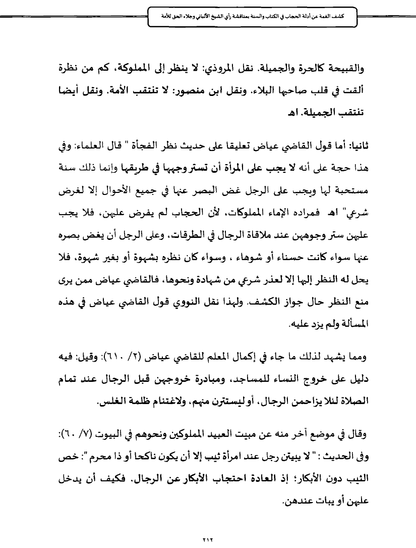 ثانيا: أما قول القاضي عياض تعليقا على حديث نظر الفجأة " قال العلماء: وفي هذا حجة على أنه لا يجب على المرأة أن تستر وجهها في طريقها وإنما ذلك سنة مستحبة لها ويجب على الرجل غض البصر عنها في جميع الأحوال إلا لغرض شرعي" اهـ فمراده الإماء المملوكات، لأن الحجاب لم يفرض عليهن، فلا يجب عليهن ستر وجوههن عند ملاقاة الرجال في الطرقات، وعلى الرجل أن يغض بصره عنها سواء كانت حسناء أو شوهاء، وسواء كان نظره بشهوة أو بغير شهوة، فلا يحل له النظر إليها إلا لعذر شرعي من شهادة ونحوها، فالقاضي عياض ممن يرى منع النظر حال جواز الكشف. ولهذا نقل النووي قول القاضي عياض في هذه المسألة ولم يزد عليه.