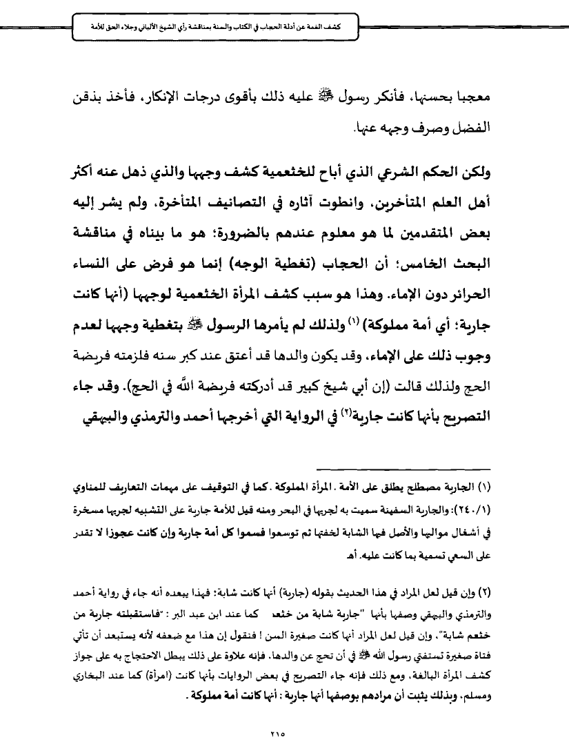 (¬٢) وإن قيل لعل المراد في هذا الحديث بقوله (جارية) أنها كانت شابة؛ فهذا يبعده أنه جاء في رواية أحمد والترمذي والبيهقي وصفها بأنها "جارية شابة من خثعم" كما عند ابن عبد البر: "فاستقبلته جارية من خثعم شابة"، وإن قيل لعل المراد أنها كانت صغيرة السن! فنقول إن هذا مع ضعفه لأنه يستبعد أن تأتي فتاة صغيرة تستفتي رسول الله - صلى الله عليه وسلم - في أن تحج عن والدها، فإنه علاوة على ذلك يبطل الاحتجاج به على جواز كشف المرأة البالغة، ومع ذلك فإنه جاء التصريح في بعض الروايات بأنها كانت (امرأة) كما عند البخاري ومسلم، وبذلك يثبت أن مرادهم بوصفها أنها جارية: أنها كانت أمة مملوكة.