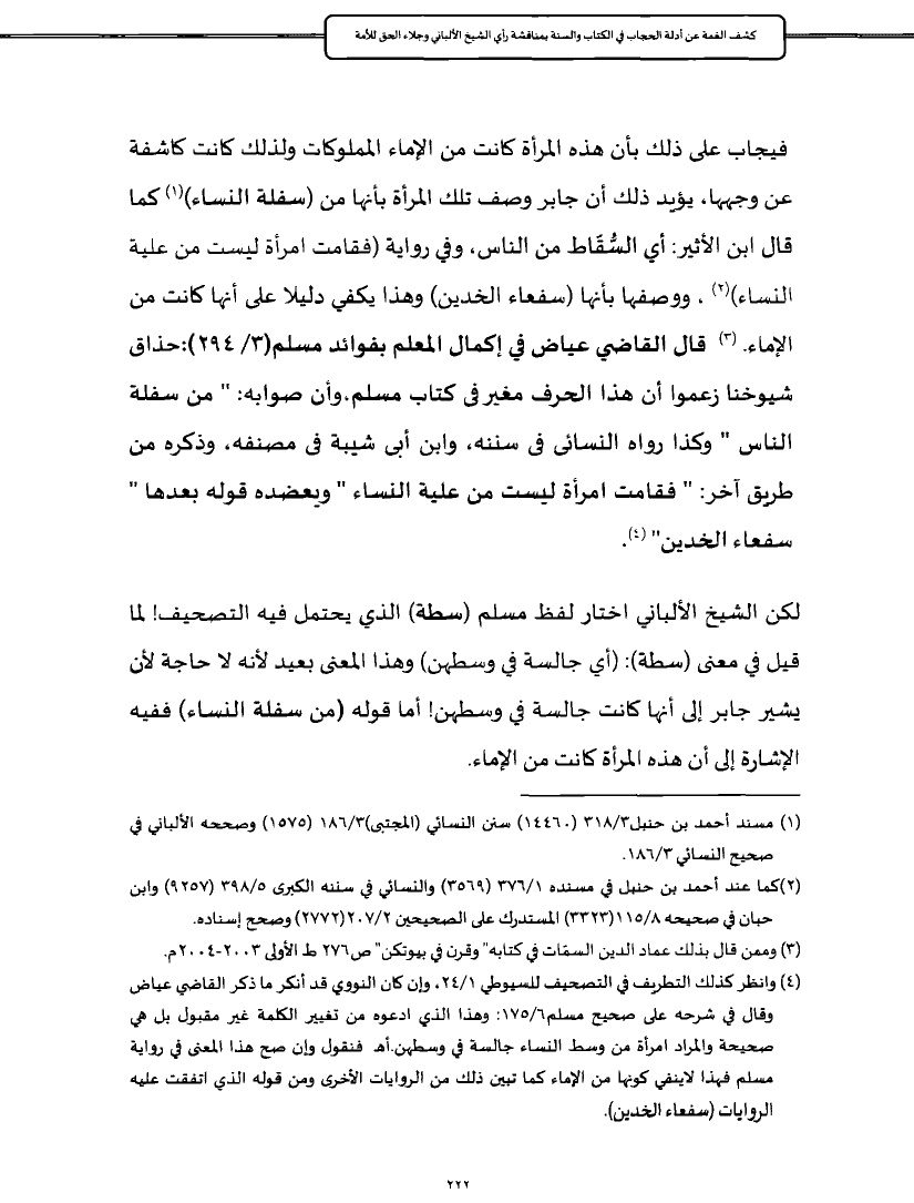 فيجاب على ذلك بأن هذه المرأة كانت من الإماء المملوكات ولذلك كانت كاشفة عن وجهها، يؤيد ذلك أن جابر وصف تلك المرأة بأنها من (سفلة النساء) (¬١) كما قال ابن الأثير: أي السُّقّاط من الناس، وفي رواية (فقامت امرأة ليست من علية النساء) (¬٢)، ووصفها بأنها (سفعاء الخدين) وهذا يكفي دليلا على أنها كانت من الإماء. (¬٣) قال القاضي عياض في إكمال المعلم بفوائد مسلم (٣/ ٢٩٤): حذاق شيوخنا زعموا أن هذا الحرف مغير فى كتاب مسلم، وأن صوابه: " من سفلة الناس " وكذا رواه النسائى فى سننه، وابن أبى شيبة فى مصنفه، وذكره من طريق آخر: " فقامت امرأة ليست من علية النساء " ويعضده قوله بعدها " سفعاء الخدين" (¬٤).