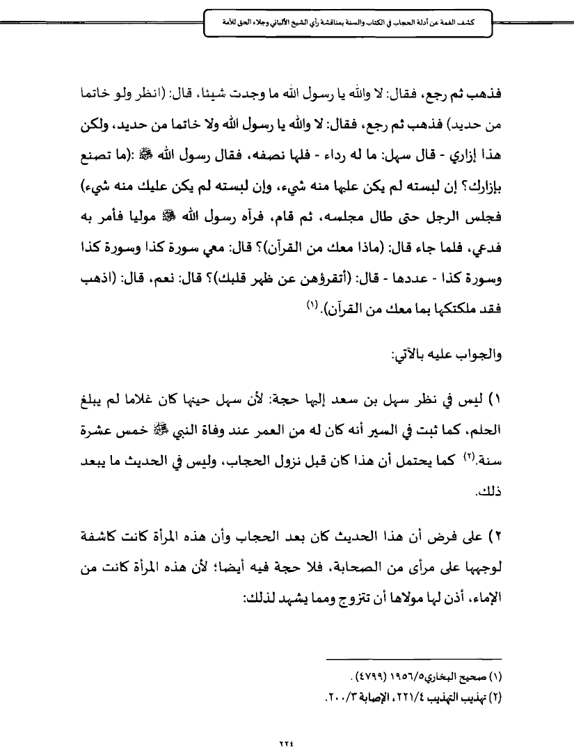 ٢) على فرض أن هذا الحديث كان بعد الحجاب وأن هذه المرأة كانت كاشفة لوجهها على مرأى من الصحابة، فلا حجة فيه أيضا؛ لأن هذه المرأة كانت من الإماء، أذن لها مولاها أن تتزوج ومما يشهد لذلك: