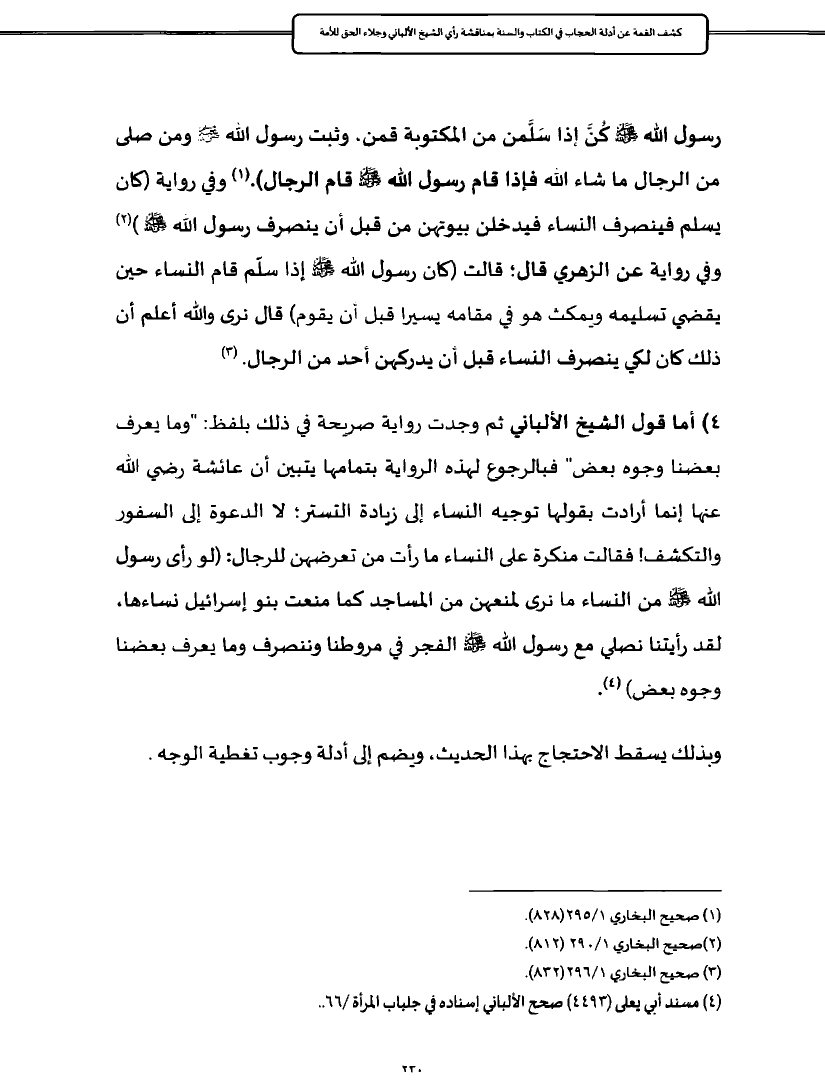 ٤) أما قول الشيخ الألباني ثم وجدت رواية صريحة في ذلك بلفظ: "وما يعرف بعضنا وجوه بعض" فبالرجوع لهذه الرواية بتمامها يتبين أن عائشة رضي الله عنها إنما أرادت بقولها توجيه النساء إلى زيادة التستر؛ لا الدعوة إلى السفور والتكشف! فقالت منكرة على النساء ما رأت من تعرضهن للرجال: (لو رأى رسول الله - صلى الله عليه وسلم - من النساء ما نرى لمنعهن من المساجد كما منعت بنو إسرائيل نساءها، لقد رأيتنا نصلي مع رسول الله - صلى الله عليه وسلم - الفجر في مروطنا وننصرف وما يعرف بعضنا وجوه بعض ((¬٤).