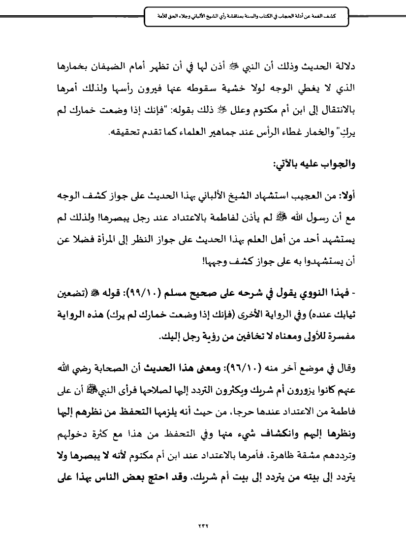 أولا: من العجيب استشهاد الشيخ الألباني بهذا الحديث على جواز كشف الوجه مع أن رسول الله - صلى الله عليه وسلم - لم يأذن لفاطمة بالاعتداد عند رجل يبصرها! ولذلك لم يستشهد أحد من أهل العلم بهذا الحديث على جواز النظر إلى المرأة فضلا عن أن يستشهدوا به على جواز كشف وجهها!