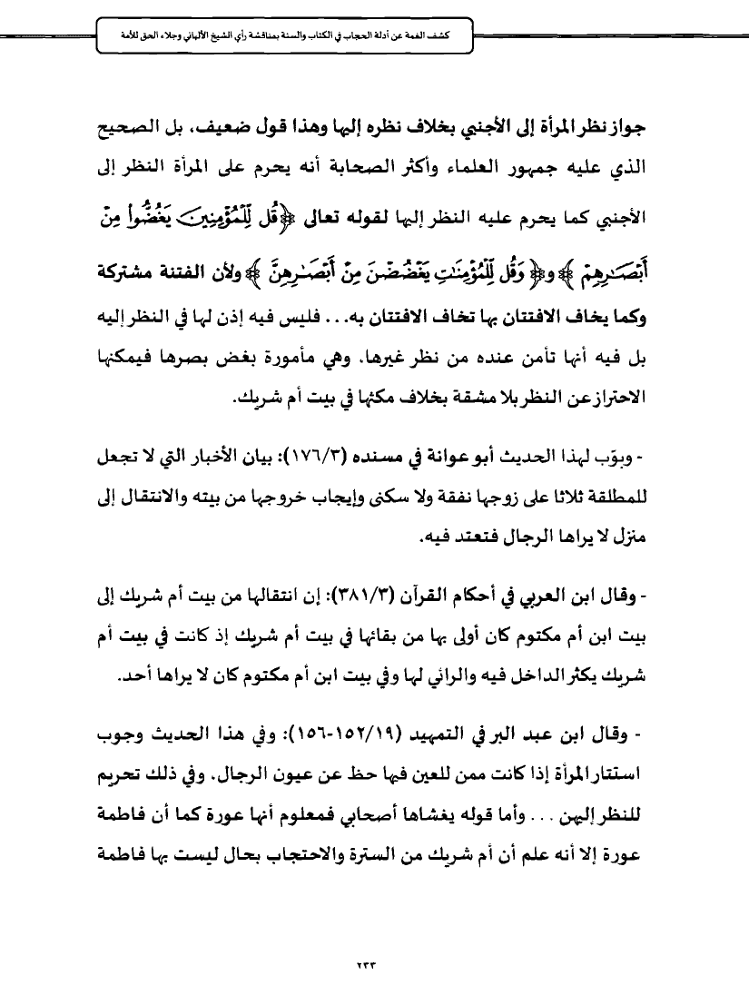 - وقال ابن عبد البر في التمهيد (١٩/ ١٥٢ - ١٥٦): وفي هذا الحديث وجوب استتار المرأة إذا كانت ممن للعين فيها حظ عن عيون الرجال، وفي ذلك تحريم للنظر إليهن. . . وأما قوله يغشاها أصحابي فمعلوم أنها عورة كما أن فاطمة عورة إلا أنه علم أن أم شريك من السترة والاحتجاب بحال ليست بها فاطمة