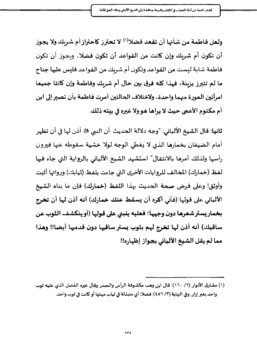 ثانيا: قال الشيخ الألباني: "وجه دلالة الحديث أن النبي - صلى الله عليه وسلم - أذن لها في أن تظهر أمام الضيفان بخمارها الذي لا يغطي الوجه لولا خشية سقوطه عنها فيرون رأسها ولذلك أمرها بالانتقال" استشهد الشيخ الألباني بالرواية التي جاء فيها لفظ (خمارك) المخالف للروايات الأخرى التي جاءت بلفظ (ثيابك) ورواتها أثبت وأوثق!