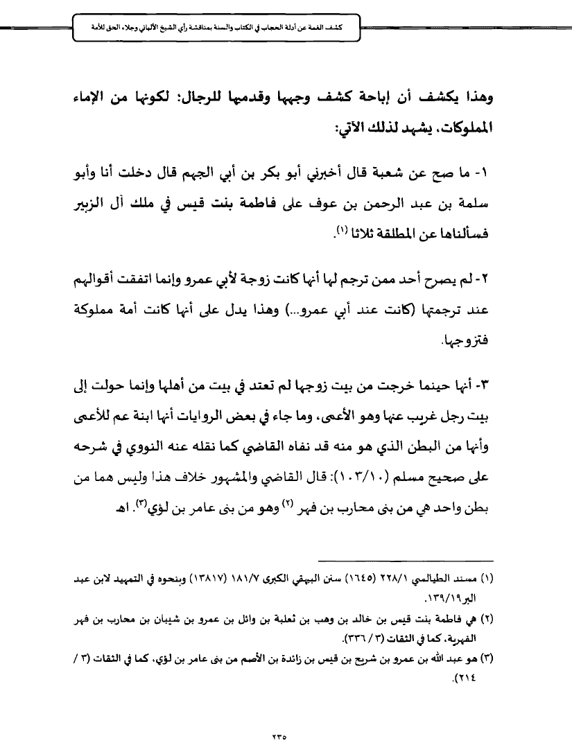٣ - أنها حينما خرجت من بيت زوجها لم تعتد في بيت من أهلها وإنما حولت إلى بيت رجل غريب عنها وهو الأعمى، وما جاء في بعض الروايات أنها ابنة عم للأعمى وأنها من البطن الذي هو منه قد نفاه القاضي كما نقله عنه النووي في شرحه على صحيح مسلم (١٠/ ١٠٣): قال القاضي والمشهور خلاف هذا وليس هما من بطن واحد هي من بنى محارب بن فهر (¬٢) وهو من بنى عامر بن لؤي (¬٣). اهـ