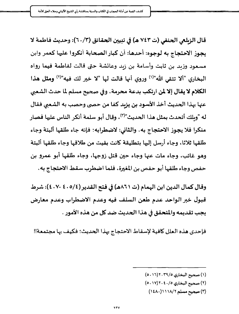 قال الزيلعي الحنفي (ت ٧٤٣ هـ) في تبيين الحقائق (٣/ ٦٠): وحديث فاطمة لا يجوز الاحتجاج به لوجوه: أحدها: أن كبار الصحابة أنكروا عليها كعمر وابن مسعود وزيد بن ثابت وأسامة بن زيد وعائشة حتى قالت لفاطمة فيما رواه البخاري "ألا تتقي الله" (¬١) وروي أنها قالت لها "لا خير لك فيه" (¬٢) ومثل هذا الكلام لا يقال إلا لمن ارتكب بدعة محرمة، وفي صحيح مسلم لما حدث الشعبي عنها بهذا الحديث أخذ الأسود بن يزيد كفا من حصى وحصب به الشعبي فقال له "ويلك أتحدث بمثل هذا الحديث" (¬٣)، وقال أبو سلمة أنكر الناس عليها فصار منكرا فلا يجوز الاحتجاج به، والثاني: لاضطرابه؛ فإنه جاء طلقها ألبتة وجاء طلقها ثلاثا، وجاء أرسل إليها بتطليقة كانت بقيت من طلاقها وجاء طلقها ألبتة وهو غائب، وجاء مات عنها وجاء حين قتل زوجها، وجاء طلقها أبو عمرو بن حفص وجاء طلقها أبو حفص بن المغيرة، فلما اضطرب سقط الاحتجاج به،