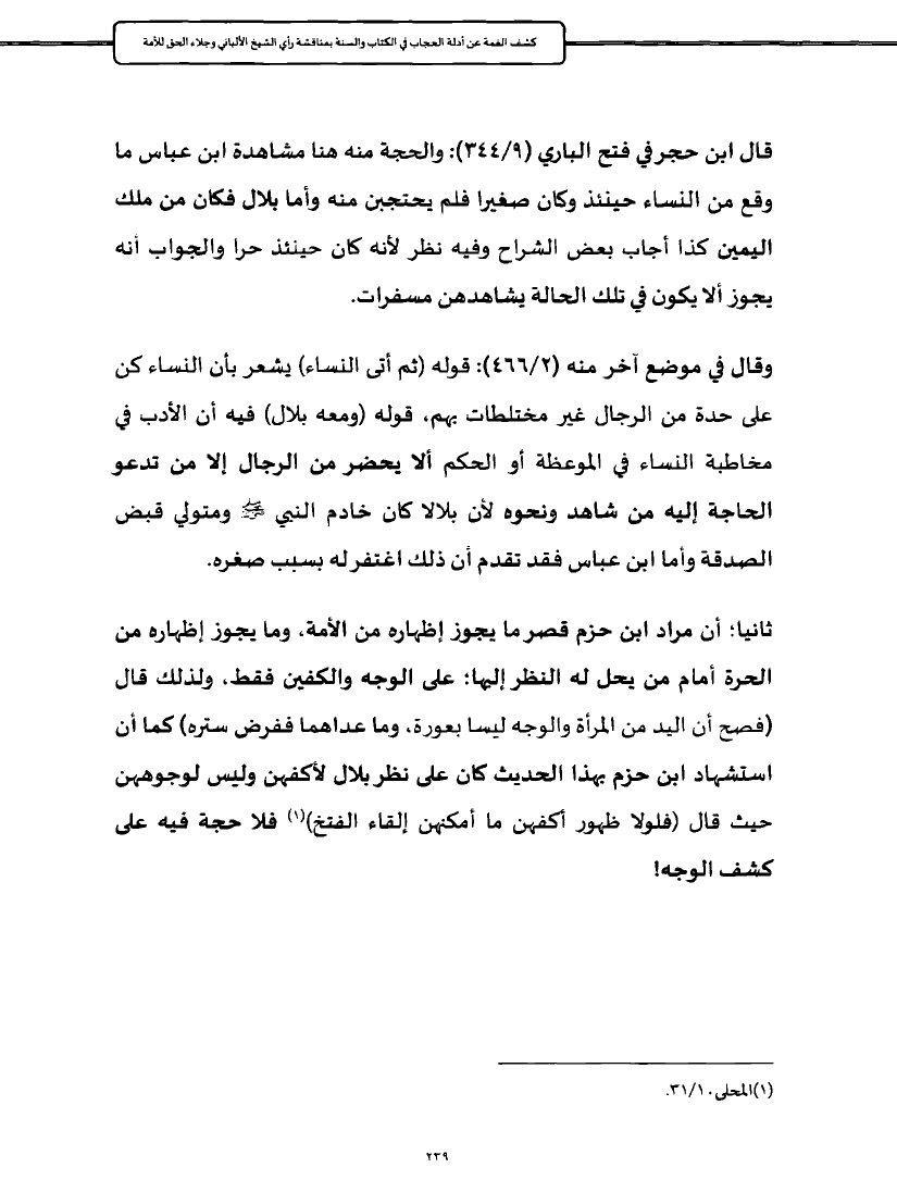ثانيا؛ أن مراد ابن حزم قصر ما يجوز إظهاره من الأمة، وما يجوز إظهاره من الحرة أمام من يحل له النظر إليها؛ على الوجه والكفين فقط، ولذلك قال (فصح أن اليد من المرأة والوجه ليسا بعورة، وما عداهما ففرض ستره) كما أن استشهاد ابن حزم بهذا الحديث كان على نظر بلال لأكفهن وليس لوجوههن حيث قال (فلولا ظهور أكفهن ما أمكنهن إلقاء الفتخ) (¬١) فلا حجة فيه على كشف الوجه!