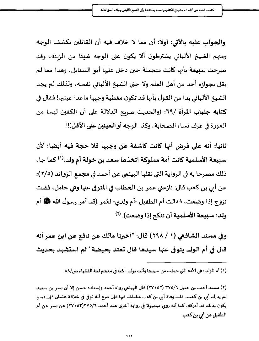 ثانيا: أنه على فرض أنها كانت كاشفة عن وجهها فلا حجة فيه أيضا؛ لأن سبيعة الأسلمية كانت أمة مملوكة اتخذها سعد بن خولة أم ولد. (¬١) كما جاء ذلك مصرحا به في الرواية التي نقلها الهيثمي عن أحمد في مجمع الزوائد (٥/ ٢): عن أبي بن كعب قال: نازعني عمر بن الخطاب في المتوفى عنها وهي حامل، فقلت تزوج إذا وضعت، فقالت أم الطفيل -أم ولدي- لعُمر (قد أمر رسول الله - صلى الله عليه وسلم - أم ولد؛ سبيعة الأسلمية أن تنكح إذا وضعت). (¬٢)