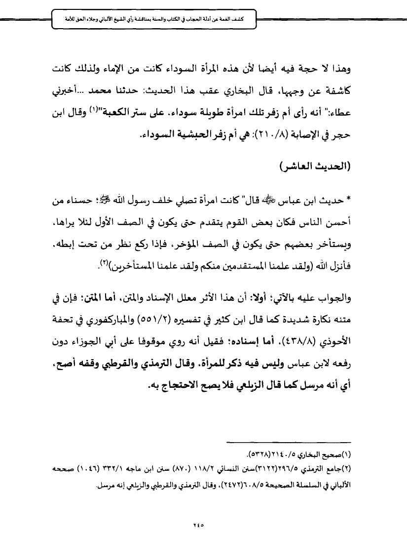 وهذا لا حجة فيه أيضا لأن هذه المرأة السوداء كانت من الإماء ولذلك كانت كاشفة عن وجهها، قال البخاري عقب هذا الحديث: حدثنا محمد ... أخبرني عطاء: " أنه رأى أم زفر تلك امرأة طويلة سوداء، على ستر الكعبة" (¬١) وقال ابن حجر في الإصابة (٨/ ٢١٠): هي أم زفر الحبشية السوداء.
