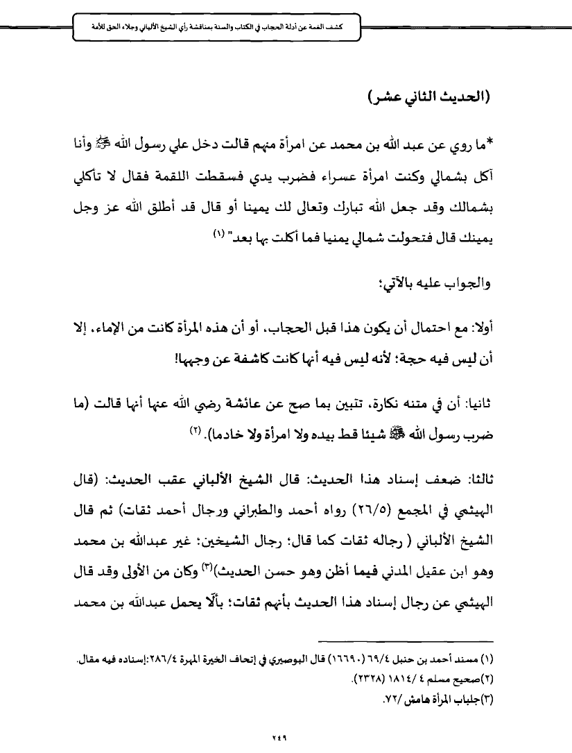 أولا: مع احتمال أن يكون هذا قبل الحجاب، أو أن هذه المرأة كانت من الإماء، إلا أن ليس فيه حجة؛ لأنه ليس فيه أنها كانت كاشفة عن وجهها!