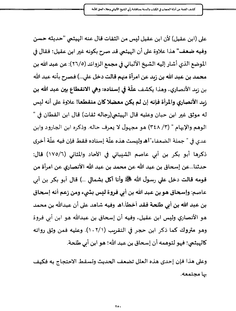 على (ابن عقيل) لأن ابن عقيل ليس من الثقات قال عنه الهيثمي "حديثه حسن وفيه ضعف" هذا علاوة على أن الهيثمي قد صرح بكونه غير ابن عقيل؛ فقال في الموضع الذي أشار إليه الشيخ الألباني في مجمع الزوائد (٥/ ٢٦): عن عبد الله بن محمد بن عبد الله بن زيد عن امرأة منهم قالت دخل علي ... ) فصرح بأنه عبد الله بن زيد الأنصاري، وهذا يكشف علّة في إسناده: وهي الانقطاع بين عبد الله بن زيد الأنصاري والمرأة فإنه إن لم يكن معضلا كان منقطعا! علاوة على أنه ليس له موثق غير ابن حبان وعليه قال الهيثمي (رجاله ثقات) قال ابن القطان في " الوهم والإيهام " (٣/ ٣٤٨) هو مجهول لا يعرف حاله. وذكره ابن الجارود وابن عدي في " جملة الضعفاء"اهـ وليست هذه علّة إسناده فقط فإن فيه علّة أخرى ذكرها أبو بكر بن أبي عاصم الشيباني في الآحاد والمثاني (٦/ ١٧٥) قال: حدثنا ... عن إسحاق بن عبد الله عن محمد بن عبد الله الأنصاري عن امرأة من قومه قالت دخل علي رسول الله - صلى الله عليه وسلم - وأنا آكل بشمالي ... ) قال أبو بكر بن أبي عاصم: وإسحاق هو بن عبد الله بن أبي فروة ليس بشيء ومن زعم أنه إسحاق بن عبد الله بن أبي طلحة فقد أخطأ. اهـ وفيه شاهد على أن عبدالله بن محمد هو الأنصاري وليس ابن عقيل، وفيه أن إسحاق بن عبدالله هو ابن أبي فروة وهو متروك كما ذكر ابن حجر في التقريب (١/ ١٠٢). وعليه فمن وثق رواته كالهيثمي؛ فهو لتوهمه أن إسحاق بن عبد الله؛ هو ابن أبي طلحة.
