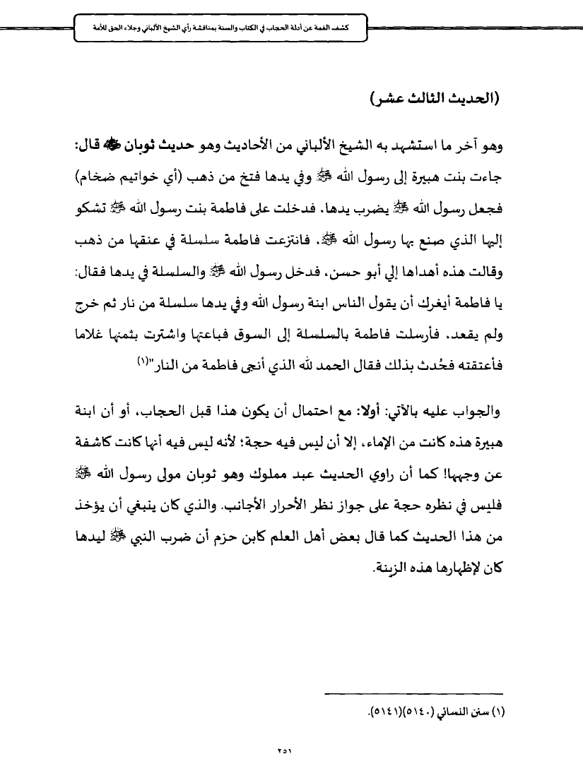 وهو آخر ما استشهد به الشيخ الألباني من الأحاديث وهو حديث ثوبان - رضي الله عنه - قال: جاءت بنت هبيرة إلى رسول الله - صلى الله عليه وسلم - وفي يدها فتخ من ذهب (أي خواتيم ضخام) فجعل رسول الله - صلى الله عليه وسلم - يضرب يدها، فدخلت على فاطمة بنت رسول الله - صلى الله عليه وسلم - تشكو إليها الذي صنع بها رسول الله - صلى الله عليه وسلم -، فانتزعت فاطمة سلسلة في عنقها من ذهب وقالت هذه أهداها إلي أبو حسن، فدخل رسول الله - صلى الله عليه وسلم - والسلسلة في يدها فقال: يا فاطمة أيغرك أن يقول الناس ابنة رسول الله وفي يدها سلسلة من نار ثم خرج ولم يقعد، فأرسلت فاطمة بالسلسلة إلى السوق فباعتها واشترت بثمنها غلاما فأعتقته فحُدث بذلك فقال الحمد لله الذي أنجى فاطمة من النار" (¬١)