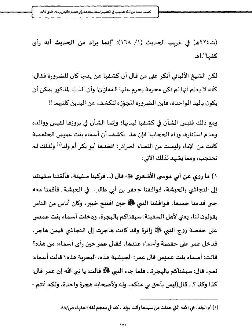 ومع ذلك فليس الشأن في كشفها ليديها؛ وإنما الشأن في بروزها لقيس ووالده وعدم استتارها وراء الحجاب! فإن هذا يكشف أن أسماء بنت عميس الخثعمية كانت من الإماء وليست من النساء الحرائر؛ اتخذها أبو بكر أم ولد (¬١) ولذلك لم تحتجب، ومما يشهد لذلك الآتي: