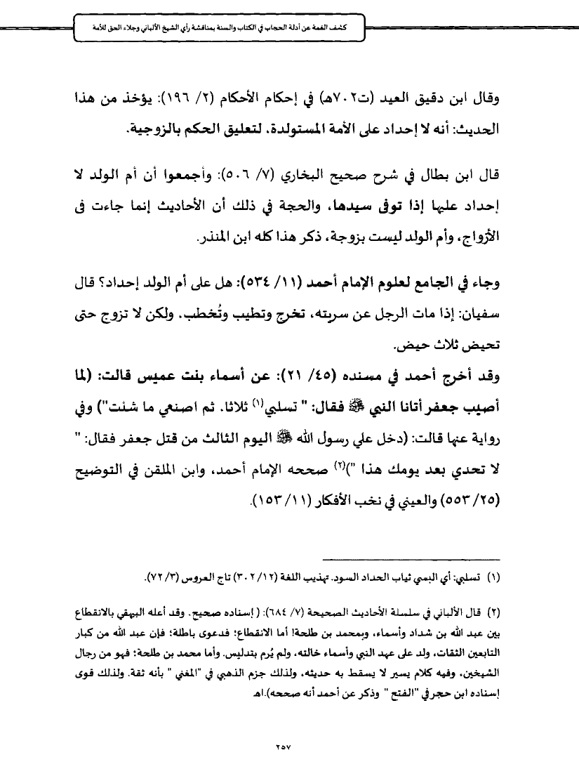 وقد أخرج أحمد في مسنده (٤٥/ ٢١): عن أسماء بنت عميس قالت: (لما أصيب جعفر أتانا النبي - صلى الله عليه وسلم - فقال: " تسلبي (¬١) ثلاثا، ثم اصنعي ما شئت") وفي رواية عنها قالت: (دخل علي رسول الله - صلى الله عليه وسلم - اليوم الثالث من قتل جعفر فقال: " لا تحدي بعد يومك هذا ") (¬٢) صححه الإمام أحمد، وابن الملقن في التوضيح (٢٥/ ٥٥٣) والعيني في نخب الأفكار (١١/ ١٥٣).
