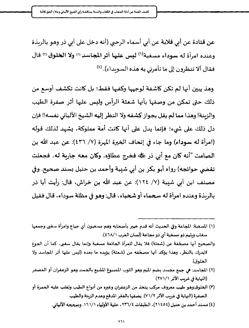 وهذ يبين أنها لم تكن كاشفة لوجهها وكفيها فقط؛ بل كانت تكشف أوسع من ذلك حتى تمكن من وصفها بأنها شعثة الرأس وليس عليها أثر صفرة الطيب والزينة! وهذا مما لم يقل بجواز كشفه ولا النظر إليه الشيخ الألباني نفسه!! فإن دل ذلك على شيء؛ فإنما يدل على أنها كانت أمة مملوكة، يشهد لذلك قوله (امرأة له سوداء) وما جاء في إتحاف الخيرة المهرة (٧/ ٤٣٦): عن عبد الله بن الصامت "أنه كان مع أبي ذر - رضي الله عنه - فخرج عطاؤه، وكان معه جارية له، فجعلت تقضي حوائجه) رواه أبو بكر بن أبي شيبة وأحمد بن حنبل بسند صحيح. وفي مصنف ابن أبي شيبة (٧/ ١٢٤): عن عبد الله بن خراش، قال: رأيت أبا ذر بالربذة وعنده امرأة له سحماء أو شحباء، قال: وهو في مظلة سوداء، قال فقيل