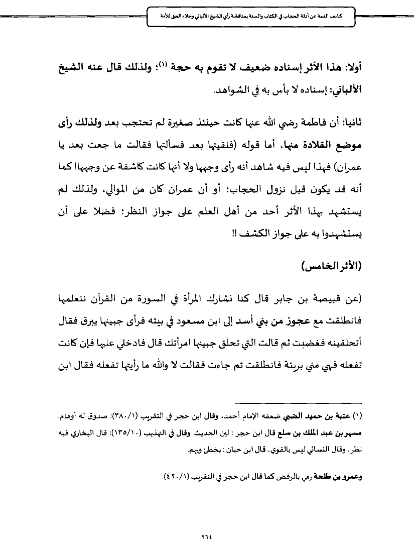 ثانيا: أن فاطمة رضي الله عنها كانت حينئذ صغيرة لم تحتجب بعد ولذلك رأى موضع القلادة منها، أما قوله (فلقيتها بعد فسألتها فقالت ما جعت بعد يا عمران) فهذا ليس فيه شاهد أنه رأى وجهها ولا أنها كانت كاشفة عن وجهها! كما أنه قد يكون قبل نزول الحجاب؛ أو أن عمران كان من الموالي، ولذلك لم يستشهد بهذا الأثر أحد من أهل العلم على جواز النظر؛ فضلا على أن يستشهدوا به على جواز الكشف!!
