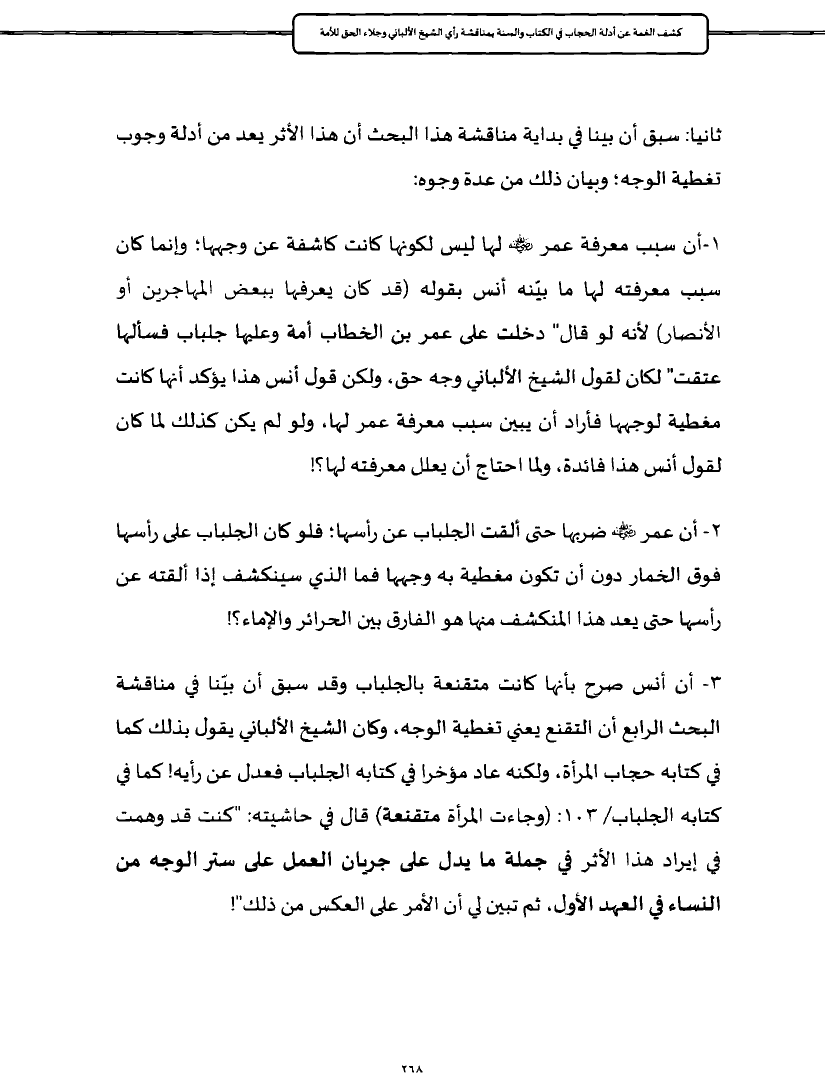 ٢ - أن عمر - رضي الله عنه - ضربها حتى ألقت الجلباب عن رأسها؛ فلو كان الجلباب على رأسها فوق الخمار دون أن تكون مغطية به وجهها فما الذي سينكشف إذا ألقته عن رأسها حتى يعد هذا المنكشف منها هو الفارق بين الحرائر والإماء؟!