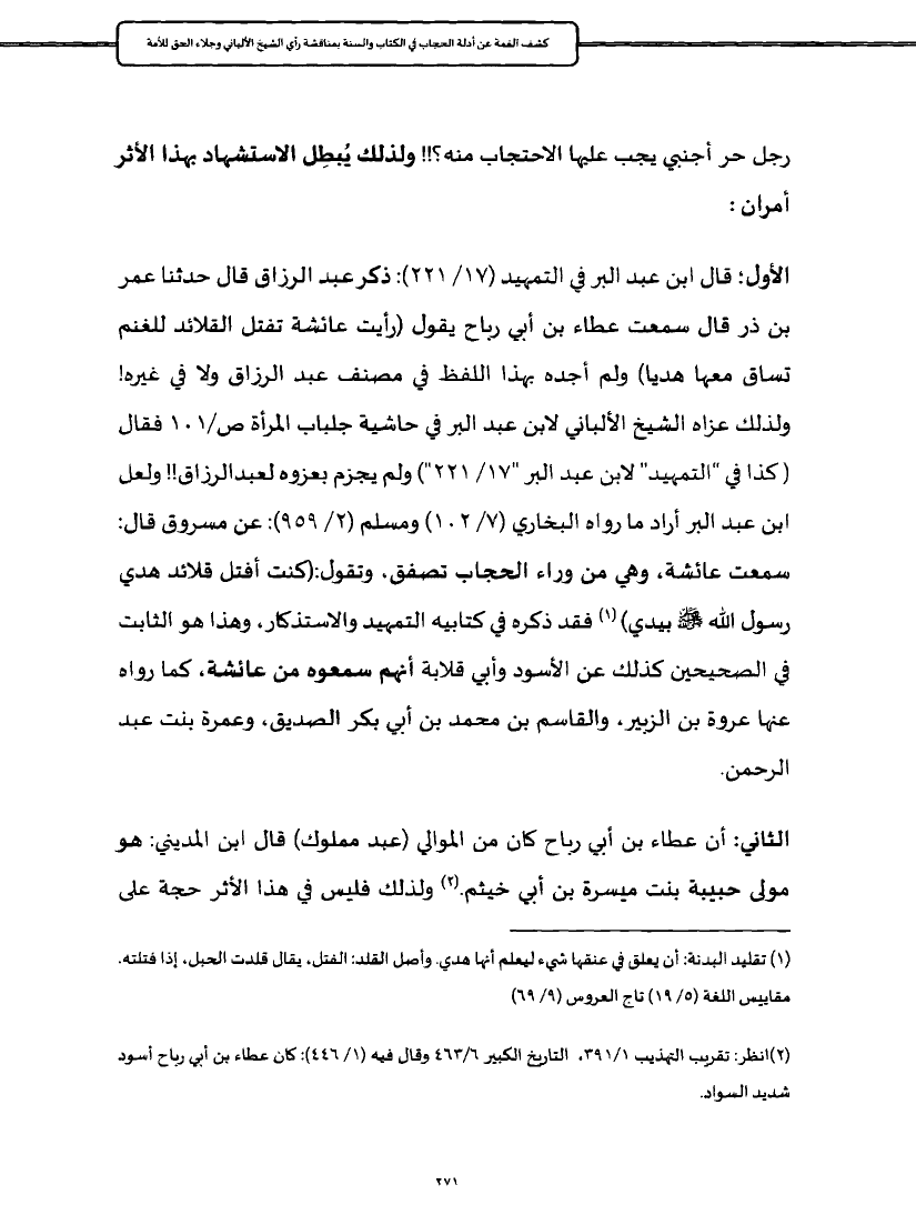 رجل حر أجنبي يجب عليها الاحتجاب منه؟!! ولذلك يُبطِل الاستشهاد بهذا الأثر أمران: