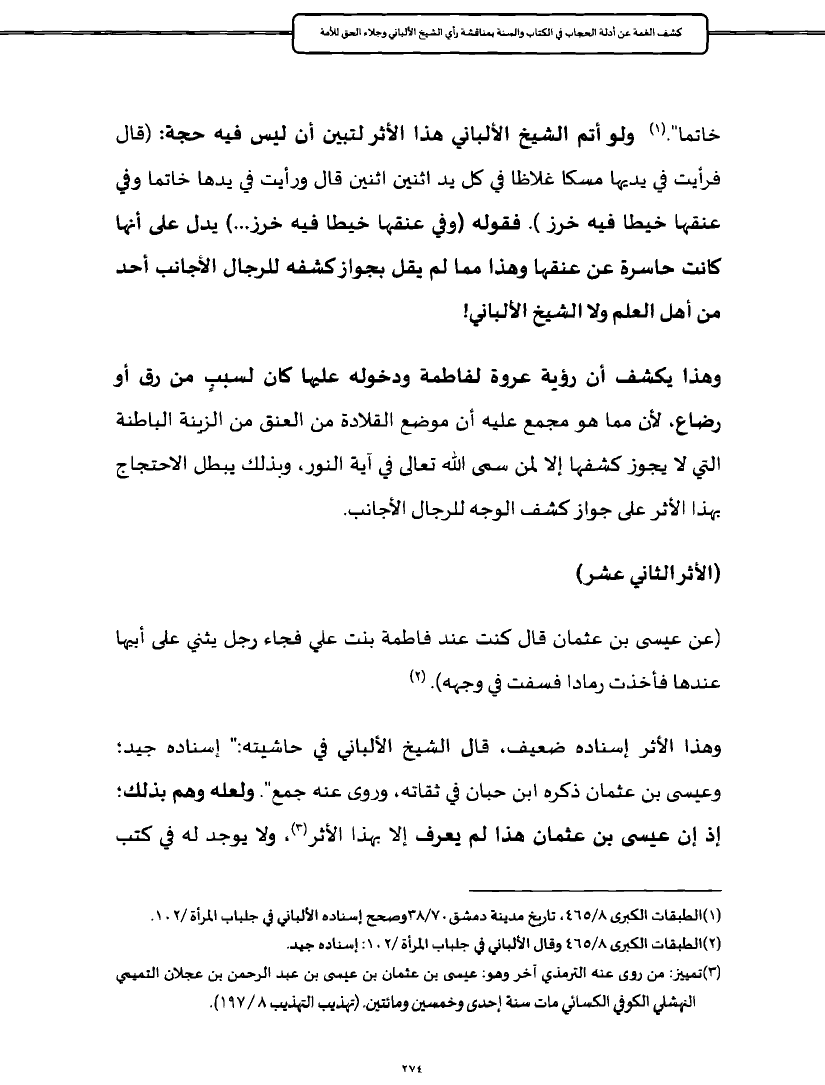 خاتما". (¬١) ولو أتم الشيخ الألباني هذا الأثر لتبين أن ليس فيه حجة: (قال فرأيت في يديها مسكا غلاظا في كل يد اثنين اثنين قال ورأيت في يدها خاتما وفي عنقها خيطا فيه خرز). فقوله (وفي عنقها خيطا فيه خرز ... ) يدل على أنها كانت حاسرة عن عنقها وهذا مما لم يقل بجواز كشفه للرجال الأجانب أحد من أهل العلم ولا الشيخ الألباني!
