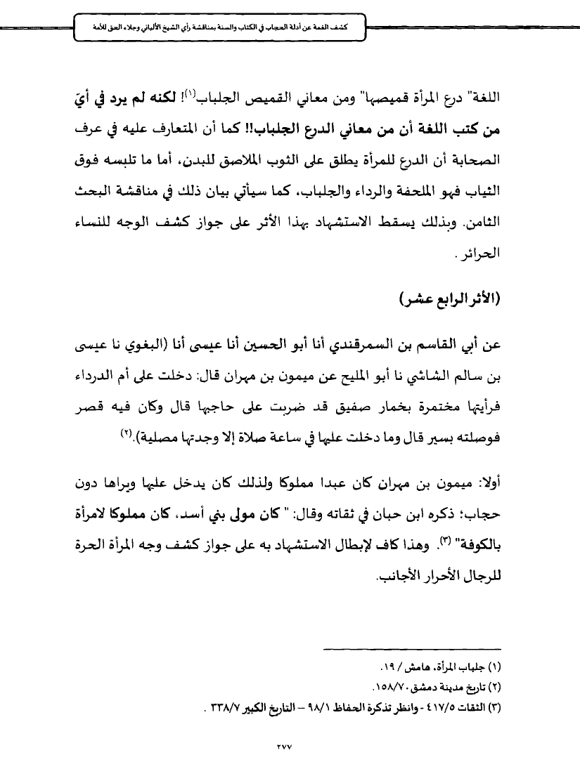 اللغة" درع المرأة قميصها" ومن معاني القميص الجلباب (¬١)! لكنه لم يرد في أيّ من كتب اللغة أن من معاني الدرع الجلباب!! كما أن المتعارف عليه في عرف الصحابة أن الدرع للمرأة يطلق على الثوب الملاصق للبدن، أما ما تلبسه فوق الثياب فهو الملحفة والرداء والجلباب، كما سيأتي بيان ذلك في مناقشة البحث الثامن. وبذلك يسقط الاستشهاد بهذا الأثر على جواز كشف الوجه للنساء الحرائر.