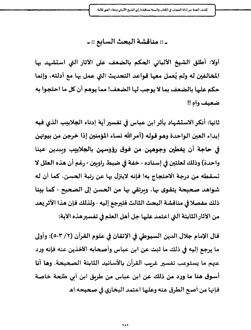 ثانيا: أنكر الاستشهاد بأثر ابن عباس في تفسير آية إدناء الجلابيب الذي فيه إبداء العين الواحدة وهو قوله (أمر الله نساء المؤمنين إذا خرجن من بيوتهن في حاجة أن يغطين وجوههن من فوق رؤوسهن بالجلابيب ويبدين عينا واحدة) وذلك لعلتين في إسناده - خفة في ضبط راويين - رغم أن هذه العلل لا تسقطه من درجة الاحتجاج به! فإنه لاينزل بها عن رتبة الحسن، كما أن له شواهد صحيحة يتقوى بها، ويرتقي بها من الحسن إلى الصحيح - كما بينا ذلك مفصلا في مناقشة البحث الثالث فليرجع إليه - ولذلك فإن هذا الأثر يعد من الآثار الثابتة التي اعتمد عليها جل أهل العلم في تفسير هذه الآية: