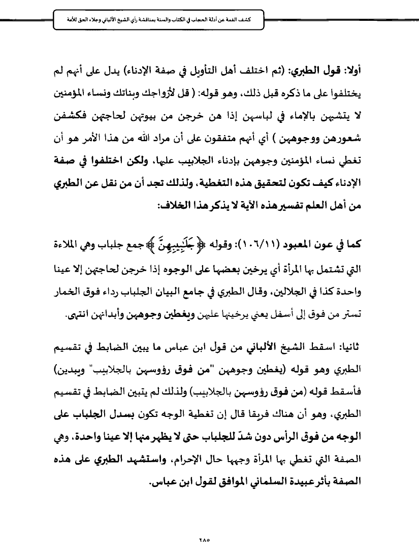 ثانيا: اسقط الشيخ الألباني من قول ابن عباس ما يبين الضابط في تقسيم الطبري وهو قوله (يغطين وجوههن "من فوق رؤوسهن بالجلابيب" ويبدين) فأسقط قوله (من فوق رؤوسهن بالجلابيب) ولذلك لم يتبين الضابط في تقسيم الطبري، وهو أن هناك فريقا قال إن تغطية الوجه تكون بسدل الجلباب على الوجه من فوق الرأس دون شدّ للجلباب حتى لا يظهر منها إلا عينا واحدة، وهي الصفة التي تغطي بها المرأة وجهها حال الإحرام، واستشهد الطبري على هذه الصفة بأثر عبيدة السلماني الموافق لقول ابن عباس.