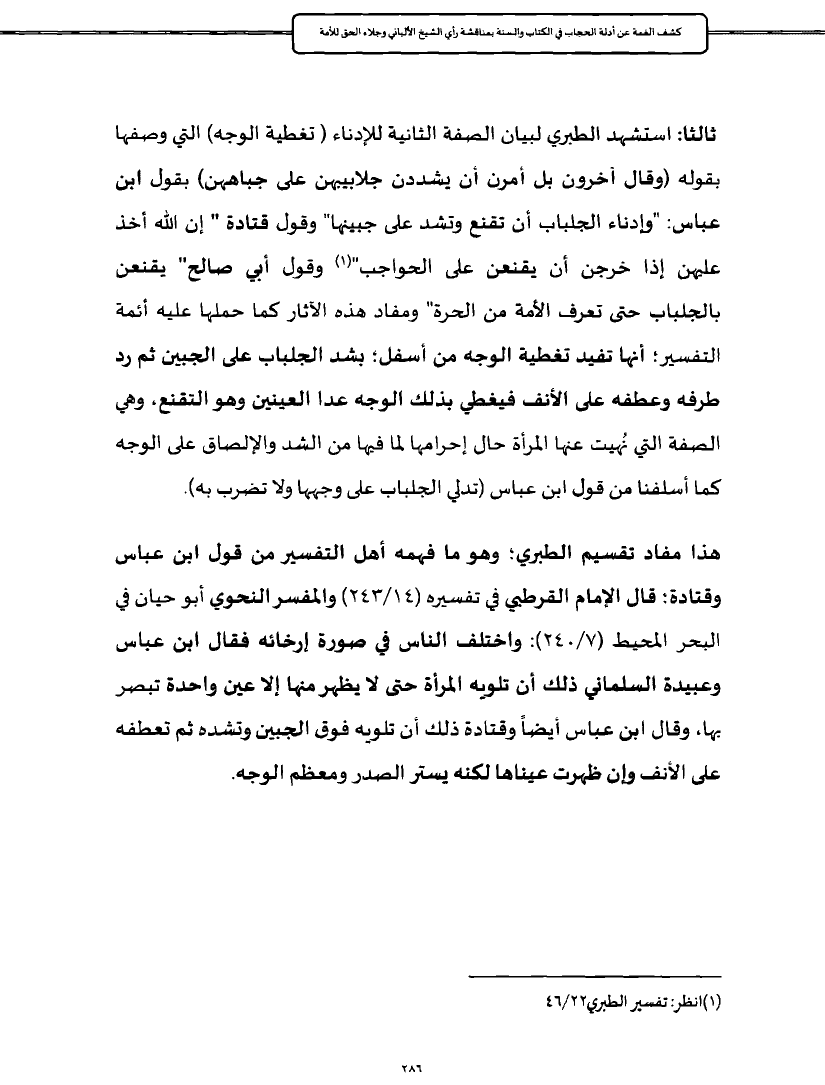 ثالثا: استشهد الطبري لبيان الصفة الثانية للإدناء (تغطية الوجه) التي وصفها بقوله (وقال آخرون بل أمرن أن يشددن جلابيبهن على جباههن) بقول ابن عباس: "وإدناء الجلباب أن تقنع وتشد على جبينها" وقول قتادة " إن الله أخذ عليهن إذا خرجن أن يقنعن على الحواجب" (¬١) وقول أبي صالح" يقنعن بالجلباب حتى تعرف الأمة من الحرة" ومفاد هذه الآثار كما حملها عليه أئمة التفسير؛ أنها تفيد تغطية الوجه من أسفل؛ بشد الجلباب على الجبين ثم رد طرفه وعطفه على الأنف فيغطي بذلك الوجه عدا العينين وهو التقنع، وهي الصفة التي نُهيت عنها المرأة حال إحرامها لما فيها من الشد والإلصاق على الوجه كما أسلفنا من قول ابن عباس (تدلي الجلباب على وجهها ولا تضرب به).