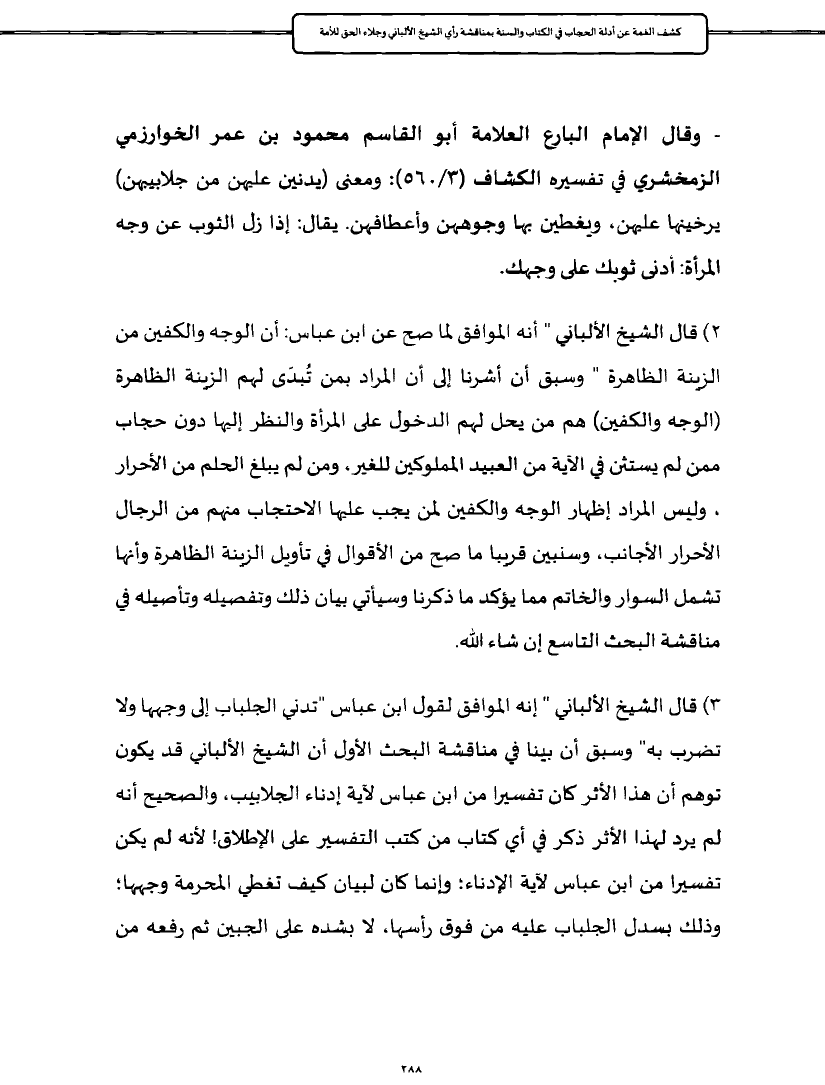 ٣) قال الشيخ الألباني " إنه الموافق لقول ابن عباس "تدني الجلباب إلى وجهها ولا تضرب به" وسبق أن بينا في مناقشة البحث الأول أن الشيخ الألباني قد يكون توهم أن هذا الأثر كان تفسيرا من ابن عباس لآية إدناء الجلابيب، والصحيح أنه لم يرد لهذا الأثر ذكر في أي كتاب من كتب التفسير على الإطلاق! لأنه لم يكن تفسيرا من ابن عباس لآية الإدناء؛ وإنما كان لبيان كيف تغطي المحرمة وجهها؛ وذلك بسدل الجلباب عليه من فوق رأسها، لا بشده على الجبين ثم رفعه من